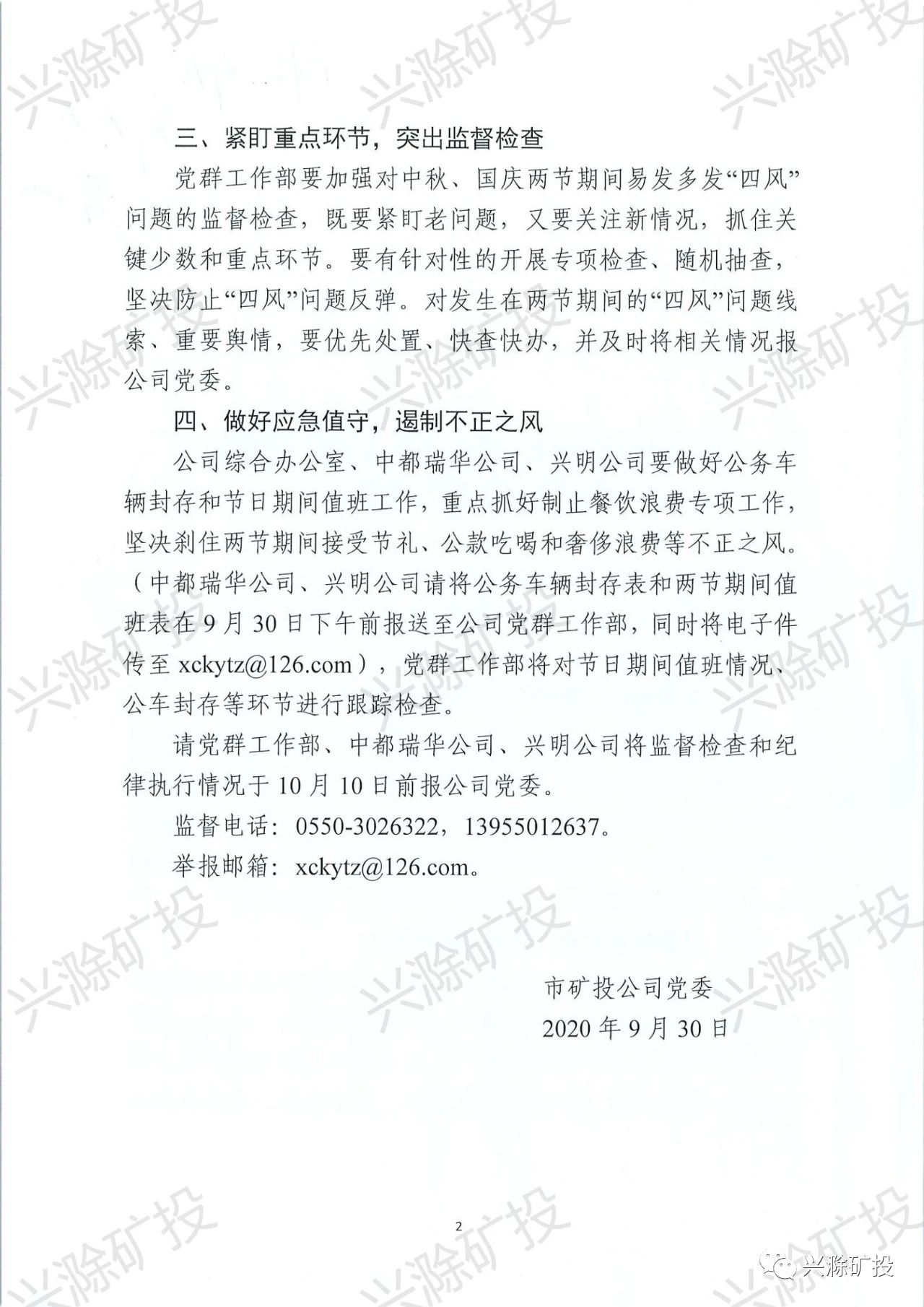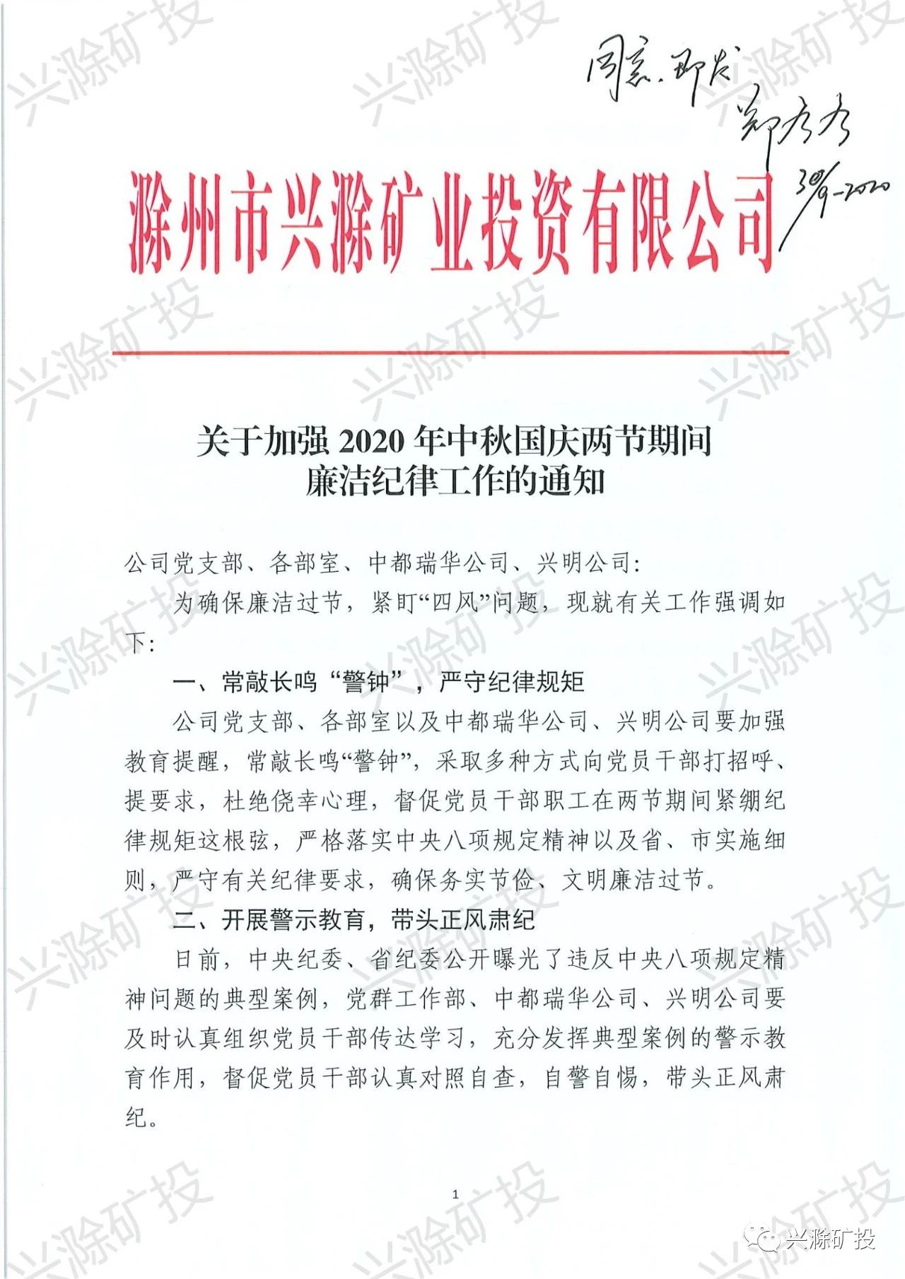市礦投公司關(guān)于加強2020年中秋國慶兩節(jié)期間廉潔紀(jì)律工作的通知