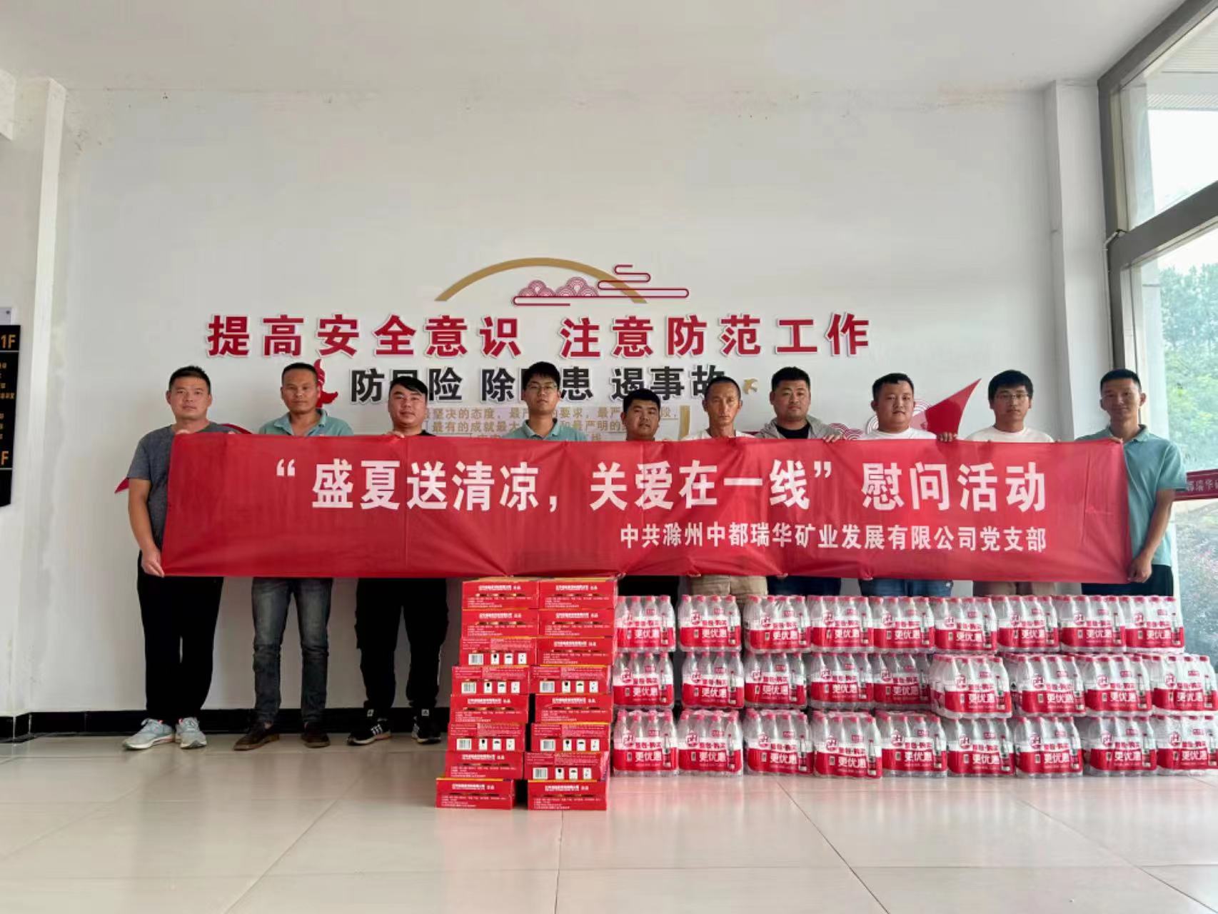 入伏以來,氣溫連續(xù)攀升。為關(guān)心一線員工身心健康,體現(xiàn)黨組織溫暖,7月28日,中都瑞華礦業(yè)黨支部組織為項(xiàng)目一線職工以及鄔崗、林山兩個(gè)運(yùn)輸車隊(duì)送上防暑降溫物品。對(duì)他們冒著酷暑仍堅(jiān)持在一線奮力工作的精神表示感謝,并叮囑他們要做好防暑工作,確保安全生產(chǎn)。